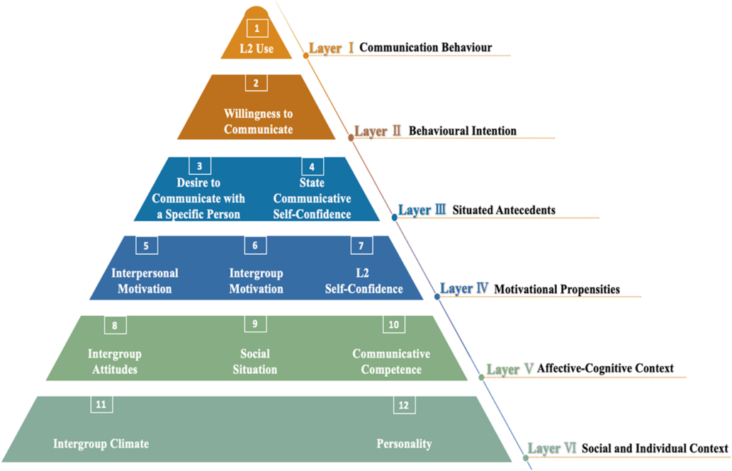 In a language classroom, motivation is essential because it incentivizes communication. Students’ willingness to communicate with others is crucial to their ability to apply their language knowledge out loud, in real life situations. A myriad of studies have analyzed what gives a learner what it takes to express themselves in the classroom and tried to model this process. To this day, the most relevant source is MacIntyre et al.’s pyramid model of Willingness To Communicate (WTO) (1998).